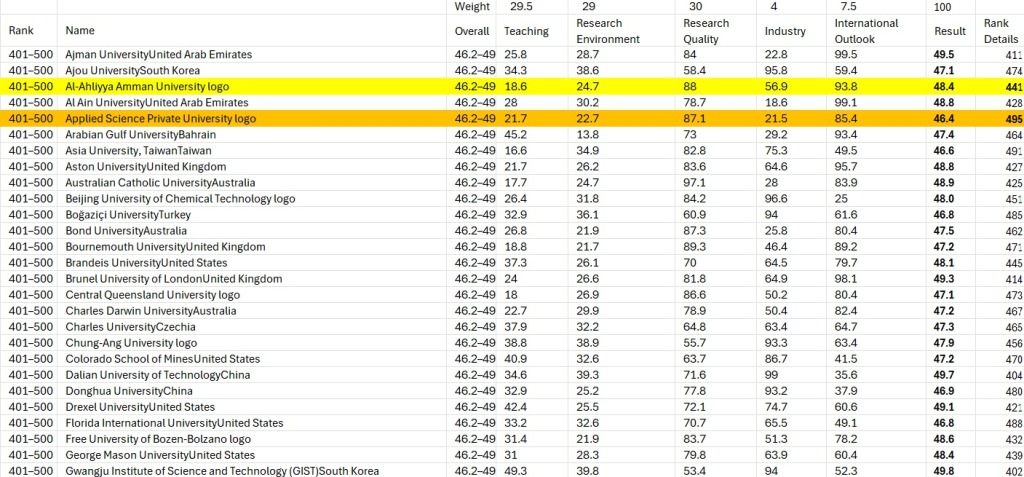 منعاً للتشويش والتضارب بنشرالأخبار حول نتائج تصنيف التايمز 2026 محلياً، تؤكد جامعة عمان الأهلية فوزها بالمركز الأول محليا ً، حيث جاءت في المرتبة 441 وبفارق 54 مرتبة عمن حل في المركز الثاني محلياً ضمن الفئة 401 – 500 عالمياً وفق الجدول المرفق الذي يوضح مجموع النقاط والمرتبة لكل جامعة ” بالتفصيل “.
