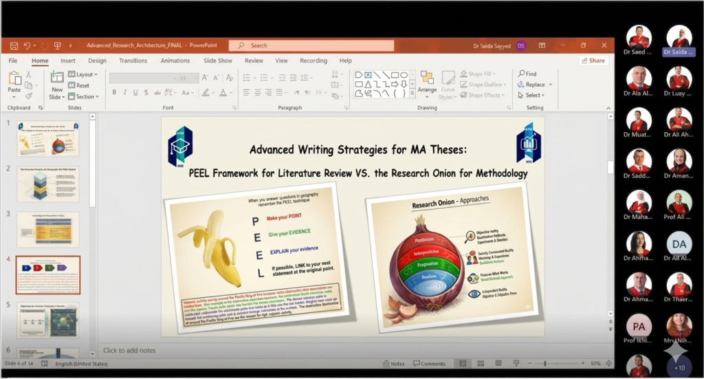 في إطار السعي المستمر لتطوير المهارات البحثية لدى طلبة الدراسات العليا، وبهدف تعزيز الممارسات الإشرافية في توعية الطلبة وتوجيههم نحو إتقان مهارات الكتابة الأكاديمية الرصينة وإعداد أطروحات علمية تتسم بالعمق المنهجي، نظمت كليتا الدراسات العليا والأعمال ورشة عمل علمية متخصصة بعنوان “استراتيجيات الكتابة المتقدمة في كتابة الرسائل الجامعية: إطار PEEL للأدبيات السابقة وبصلة البحث لمنهجية البحث العلمي”.